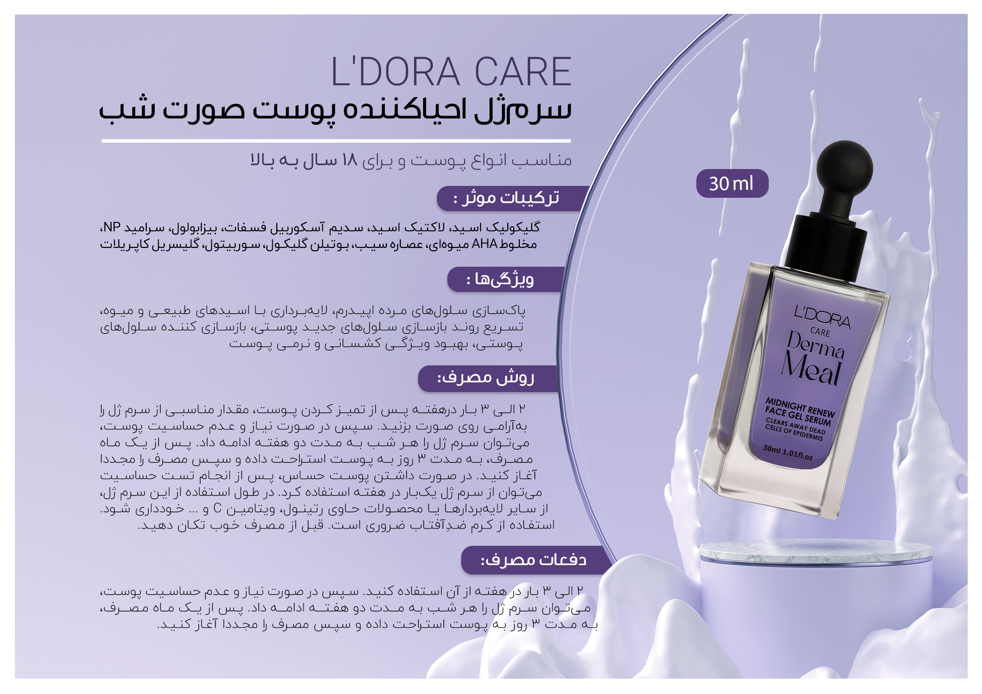 سرم ژل احیاکننده پوست صورت مناسب شب لدوراکر | ترمیم آسیب‌های ناشی از عوامل محیطی در شب