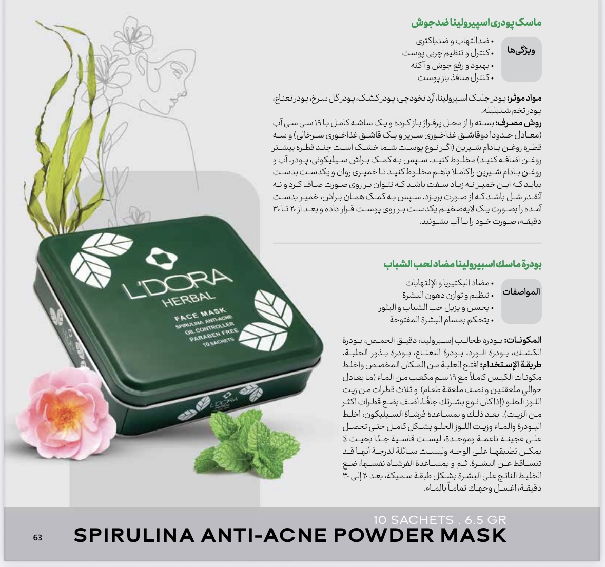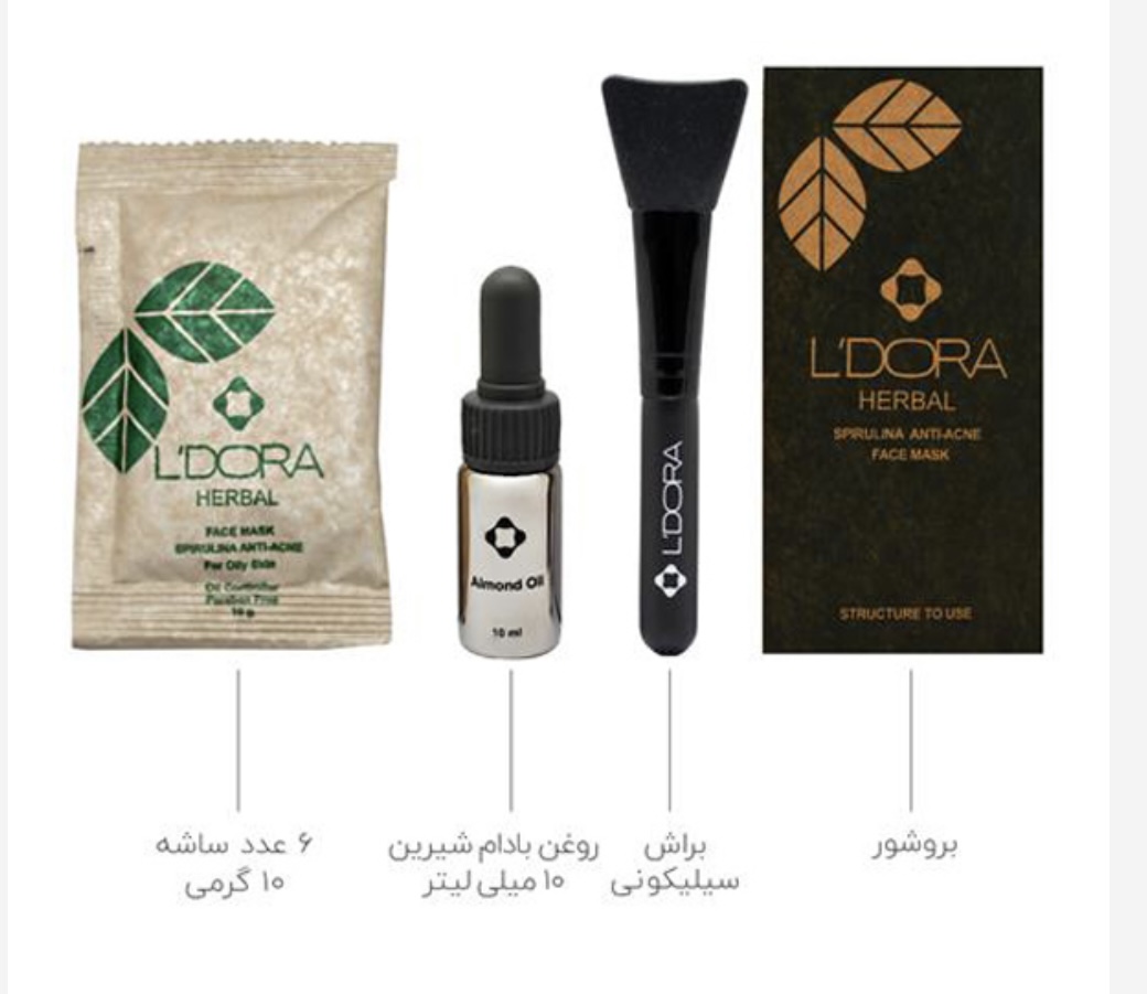 - 10 عدد ساشه ماسک پودری اسپیرولینا ضدجوش و ضد آکنه لدورا هربال