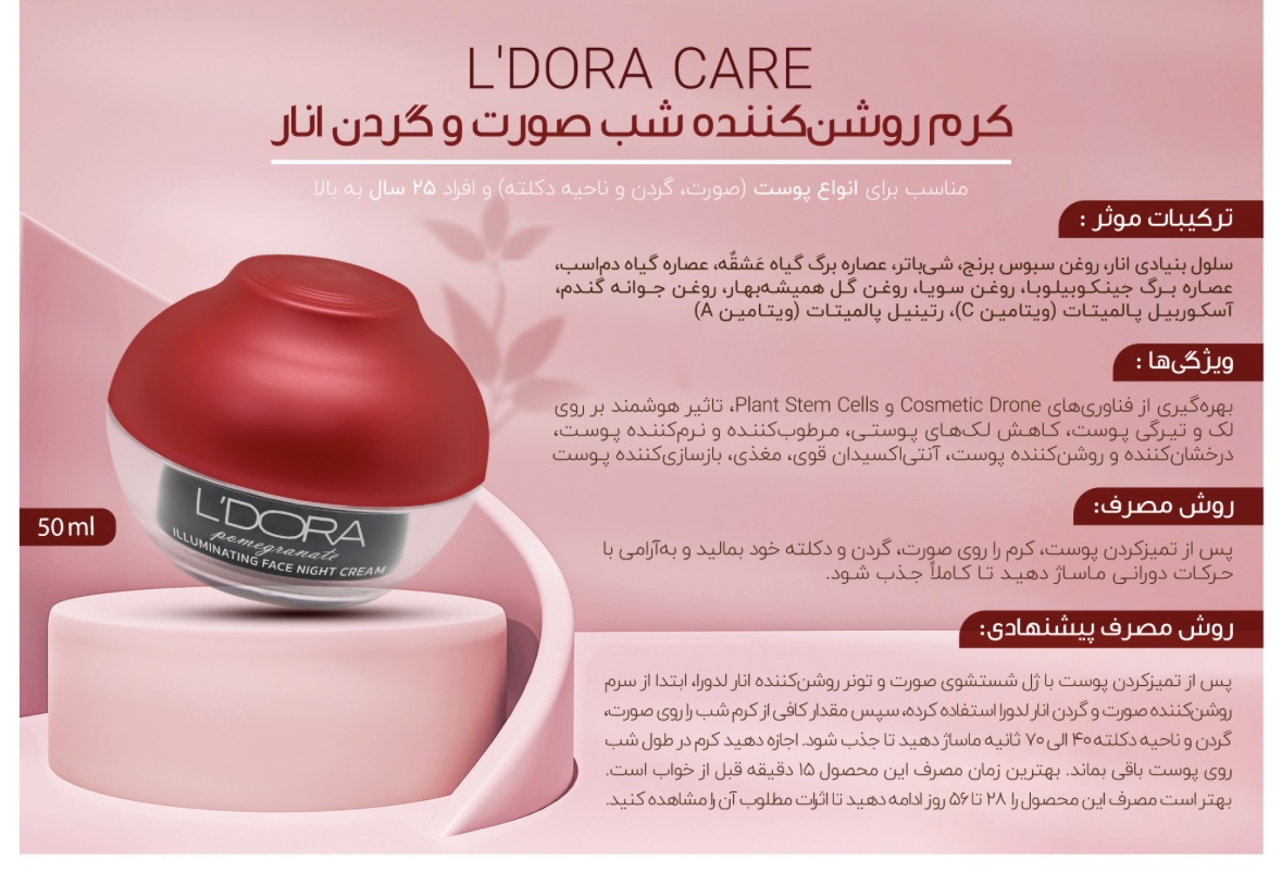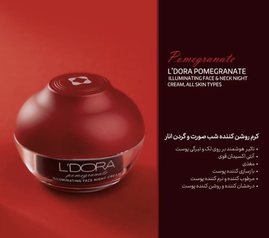 کرم روشن کننده شب صورت و گردن انار مناسب انواع پوست لدورا، 50 میلی لیتر
